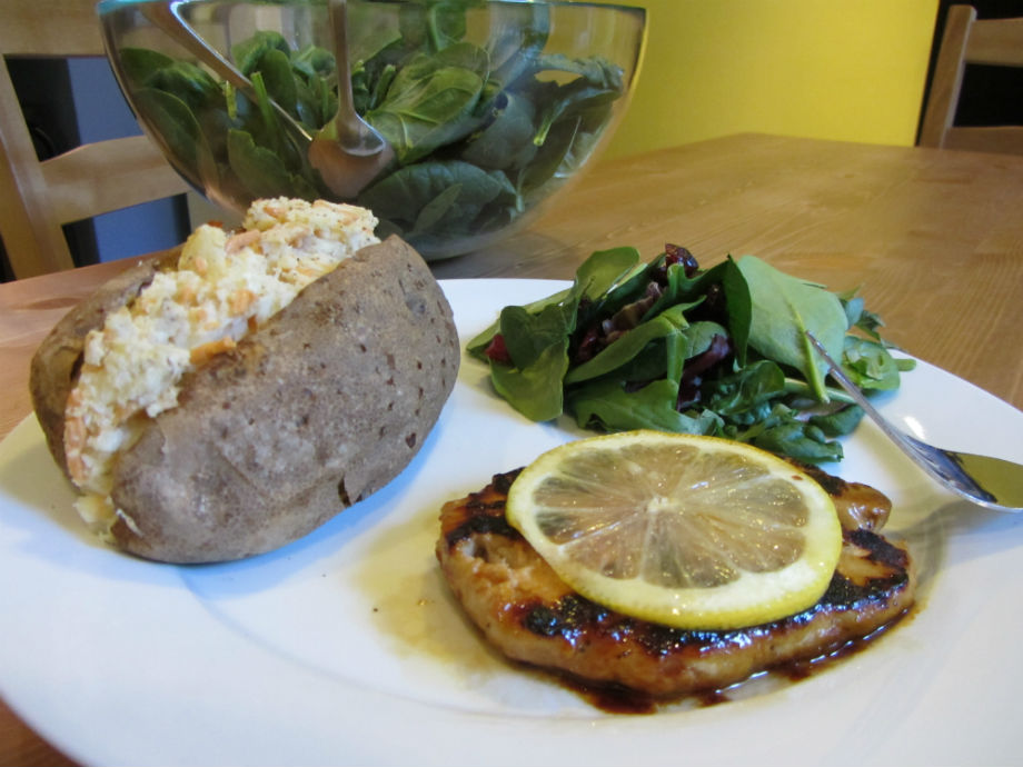 Clean the potatoes well and pierce the skin before putting them in the oven for 45 minutes. I find sometimes that much time isn’t enough so feel free to stick them in the microwave for a few minutes to finish them off.