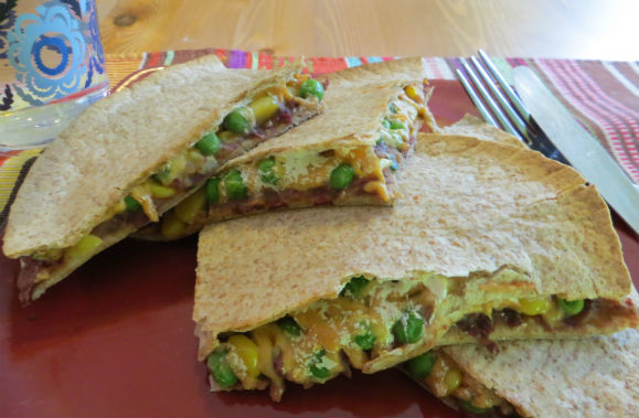 Lay 4 tortillas on your work surface. Spread with bean mixture. Sprinkle with corn, peas and cheese. Spread remaining tortillas with sour cream and invert onto filling.