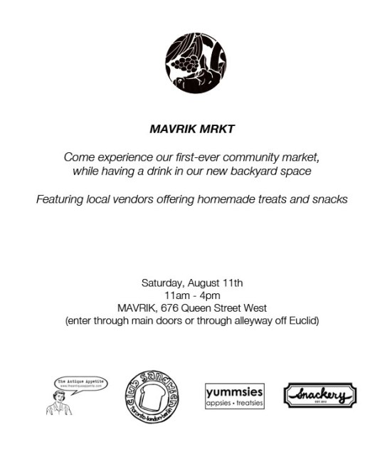 Big news time! On Saturday August 11 I will be selling some of my delicous baked goods at the very cool MAVRIK Wine Bar. This is their first market and I am very thrilled to be involved. MAVRIK is right by Trinity Bellwoods Park so stop in for a drink and then grab some cookies to-go for a park picnic. Brilliant! Prices will be reasonable. See you all there.