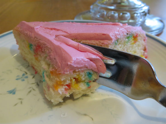 Make sure the batter isn’t too hot from the milk. Add in the rainbow sprinkles and stir in carefully so the colour doesn’t run.