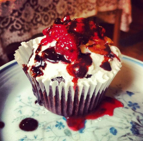 A very gourmet looking cupcake made by my friend Carly. Chocolate cupcake with vanilla frosting, chocolate sauce and raspberry compote.