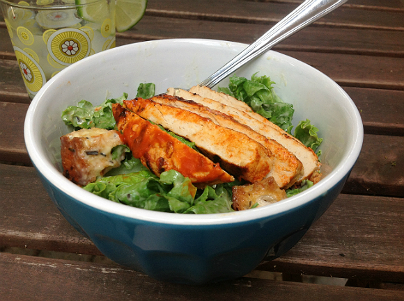 Toss the croutons and lettuce with the dressing. Serve into entree size bowls and top with as much chicken as you darn well please.